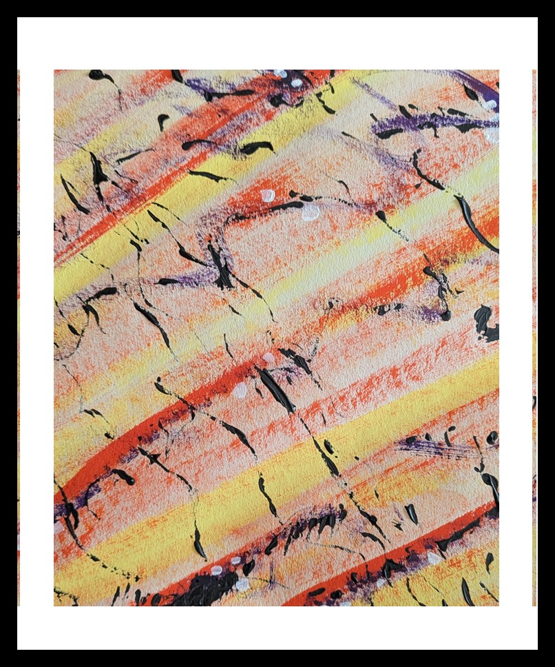 In the Moment bursts with vibrant energy and unfiltered joy. Radiating from a base of bold orange, the composition comes alive with diagonal lemon brushstrokes that cut dynamically across the page, injecting momentum and spontaneity. Splashes of violet dance playfully throughout, creating contrast and rhythm. This is a marvellously free, expressive painting, brimming with joie de vivre — a celebration of being fully present, alive, and unrestrained.